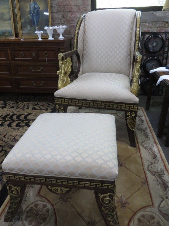 Antique French Empire Napoleonic Mahogany Swan Arm Chair With Ottoman - View Full